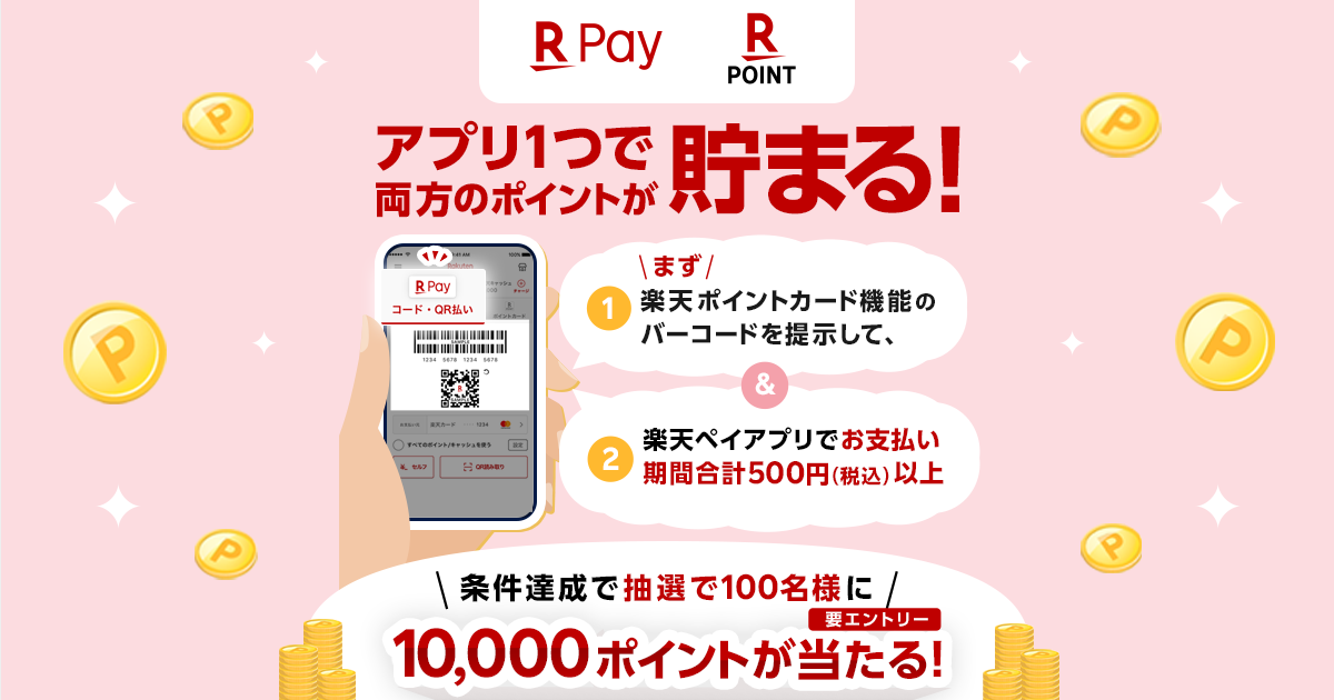 今、楽天Payのキャンペーンで、楽天PayアプリのポイントカードとPayを一緒に使うと10,000ポイントが当たるとやっています。