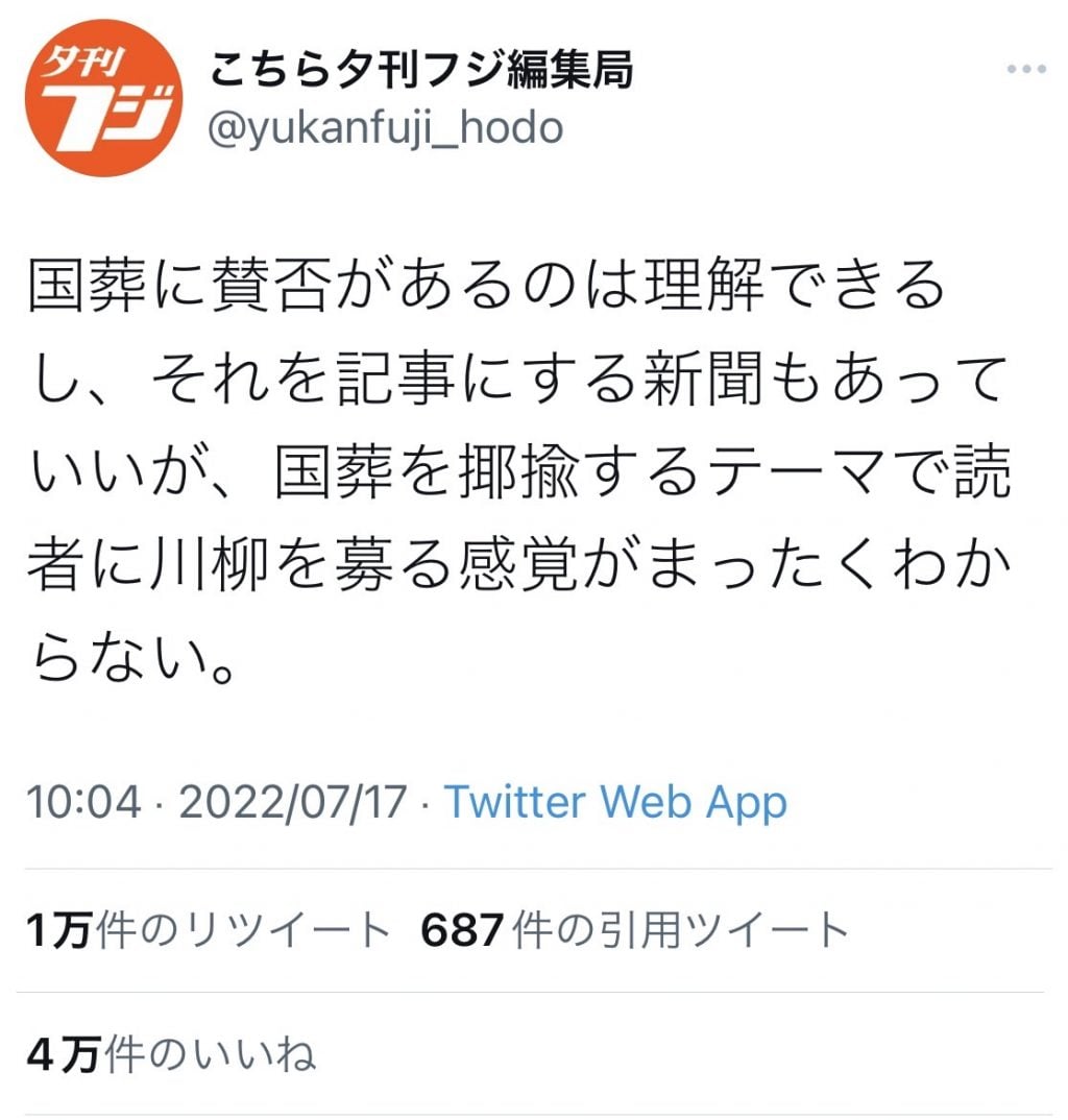 非業の死を遂げた方を、このように揶揄する川柳を投稿する人もいれば、それを採用して新聞に載せる人もいる。